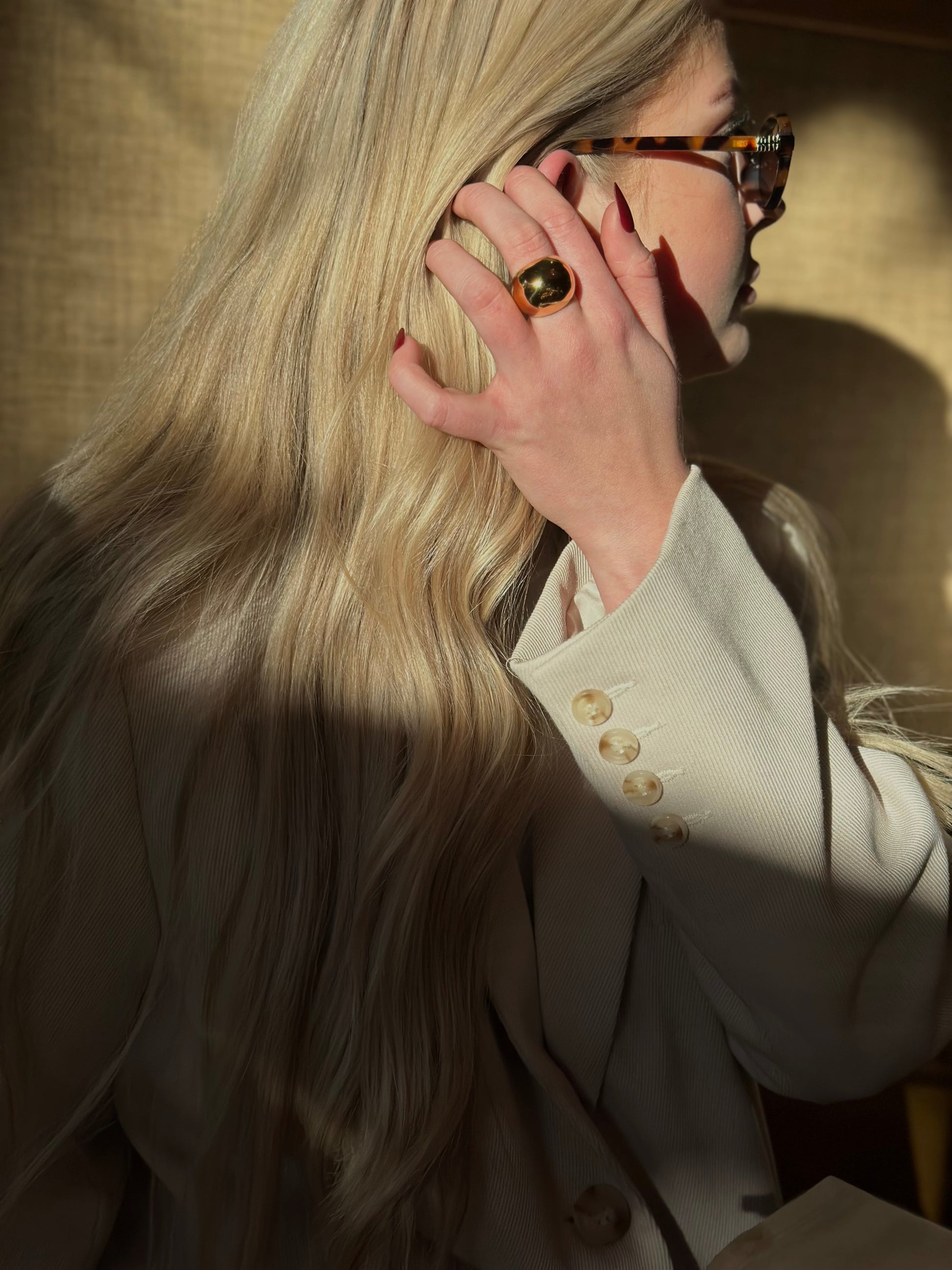 Gör ett slående intryck med sun ringen, ett djärvt iögonfallande smycke tillverkat i rostfritt stål och rikt pläterat med 18k guld. Dess stora, kupolformade design erbjuder en modern, lyxig look som lyfter vilken outfit som helst med varaktig glans och hållbarhet. Perfekt för dig som söker sofistikerade, enastående smycken med professionellt hantverksskick.